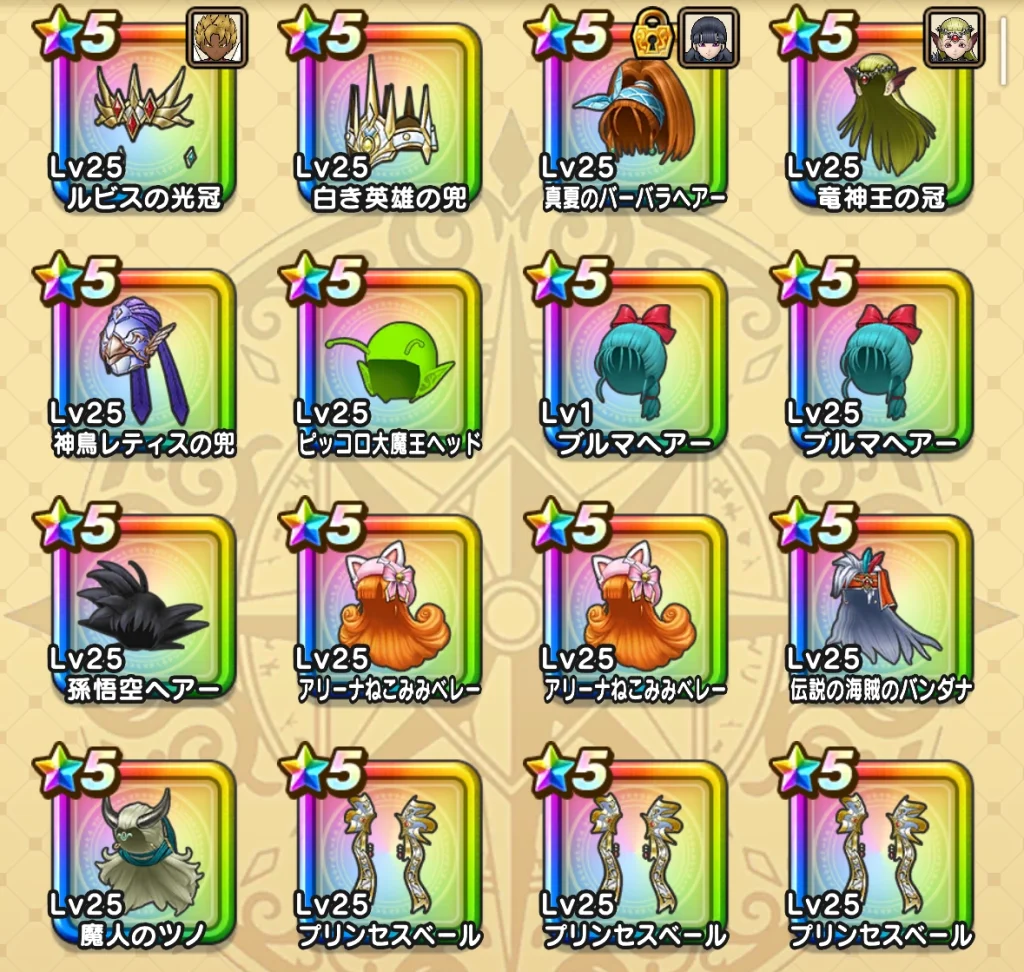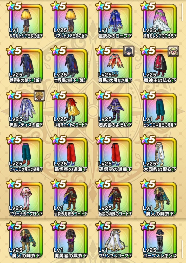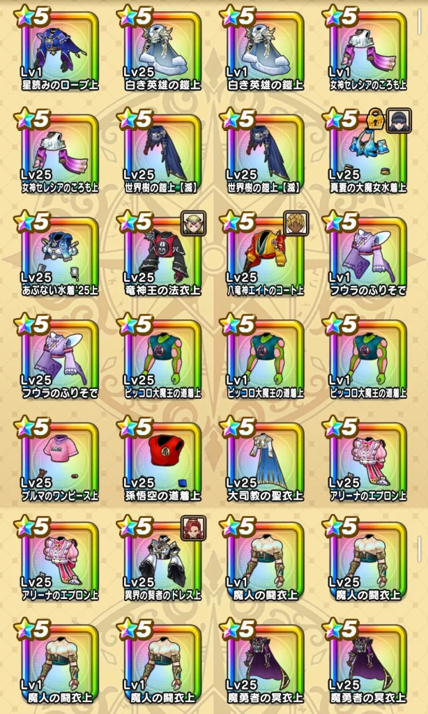 シリーズ名のところに色がついているやつは武器・防具コンプしたものになります。 孫悟空装備とか竜神王の杖装備とかはかなり当たりかなと思うのでコンプできて嬉しかったです。 真夏のまぼろしバーバラ装備も見た目が良いのが素晴らしかったですw プチマダンテに関してはあまり使いこなせてはいないのですが…