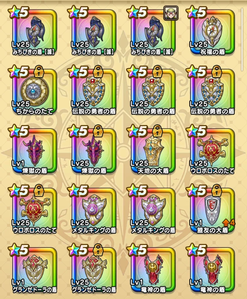 みちびきの盾はやたら出て3個も出てくれました。 ダメージを受けたときにテンションが付与(0→5)されたり、テンションを下げる効果を無効化(+いてつく波動もガード)してくれる「あらがう意思」がかなり強いのでありがたかったです