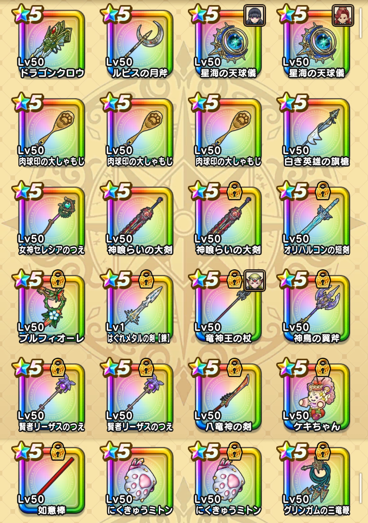 5月に実装された風乗りフウラ装備シリーズ(ケキちゃん)から確変に入ったみたいで「たいようのおうぎ」以外すべてゲットすることができました。 年初はだいぶ武器に恵まれていなかったのでモチベーションはかなり下がっていたような気がしましたがやはり武器をゲットできる・できないで大きく変わってきますね。 オリハルコンの短剣以外はそこそこ使っているかなと思いますw 6周年武器の「神喰らいの大剣」に関してはなかなか引くことができなくて、「6万ジェム突っ込むしかないのか…」と追い込まれましたがイベントの中盤から終盤に差し掛かるところで無事引くことができました。 しかも終盤にもう1本引いてしまうという神ヅモをw 武器に関しては「エスタークの魔刃」以外は引けたんじゃないかなと思ってます。 ほぼ満足です!