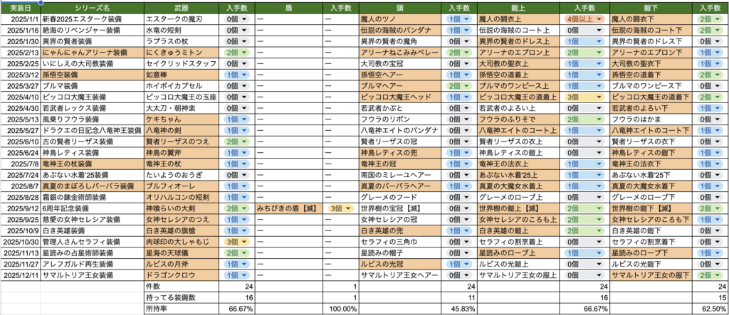 2025年は24個のシリーズが実装されました。 ↑の表の見方ですがシリーズごとの各パーツの武器・防具をいくつ取ったかをGoogleスプレッドシートを使って作ってみました(自分も使ってみたい!ということはこちらをコピーしてもらえればと思いますのでご自由にお使いください!)