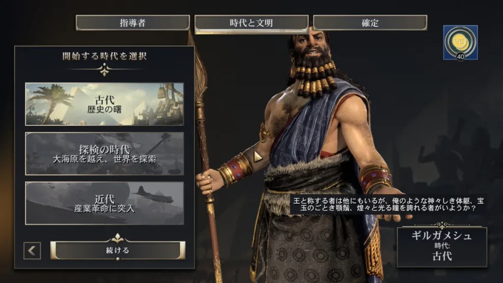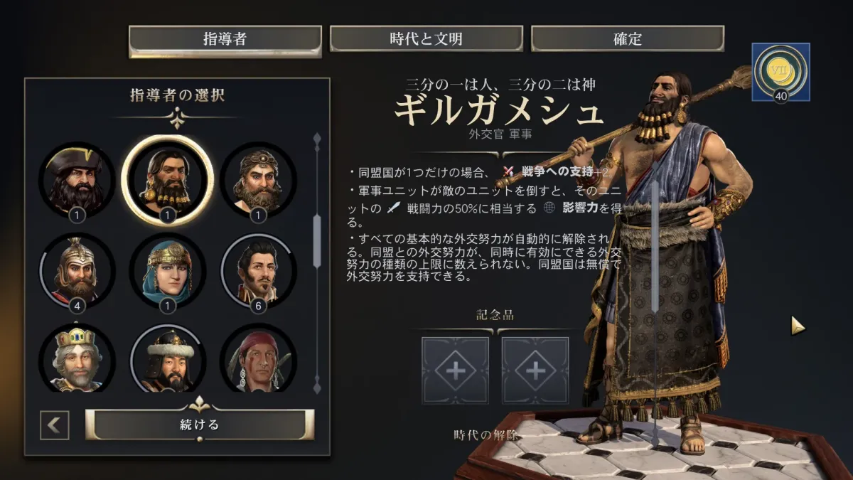 指導者はギルガメシュにしました(ギルガメッシュではない)。 1.3.2で新しく追加された指導者です。 指導者に関してはDLCで配布されるっぽいのですがもうすぐ1周年ということで無料で配布されております。
