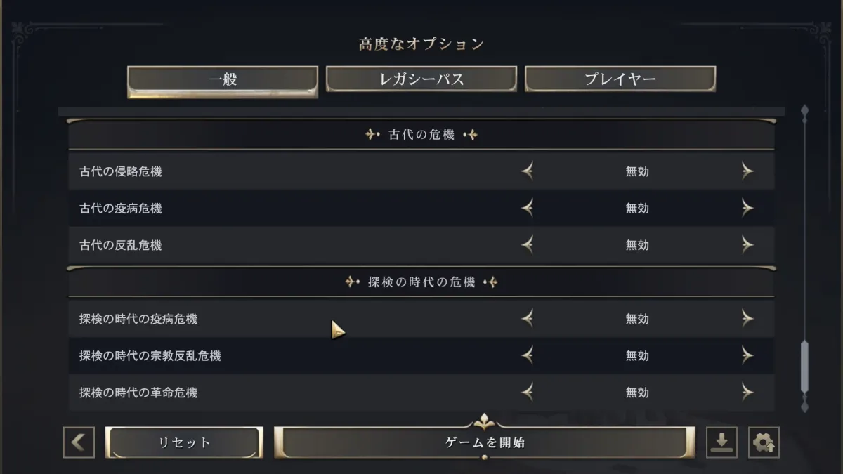 あとは高度なオプションで古代・探検の時代の危機をそれぞれ無効にしておきます。 こちらは古代や探検の時代がある程度進行していくと訪れるイベントでデバフがかかってしまいます。 正直あまりおもしろくないので田中の場合は無効でやってます。 それ以外はデフォルトの設定でやってみようと思います。「ゲームを開始」を押すとようやくゲームを開始することができます。