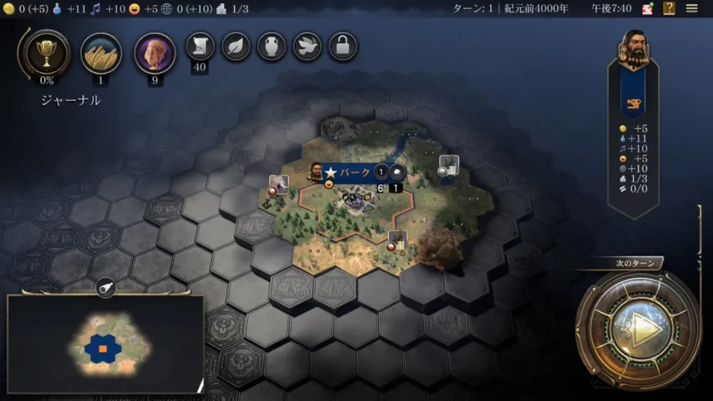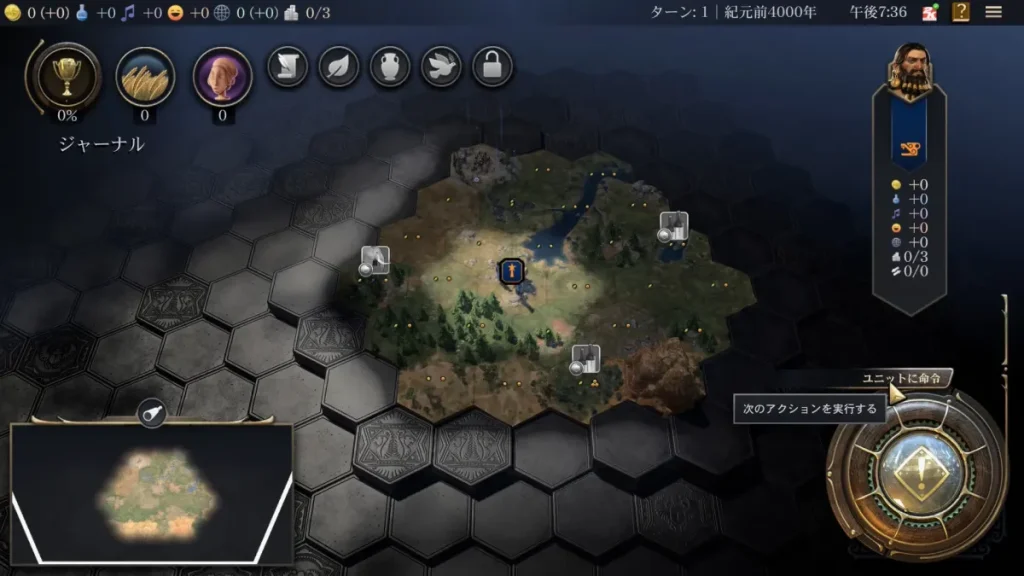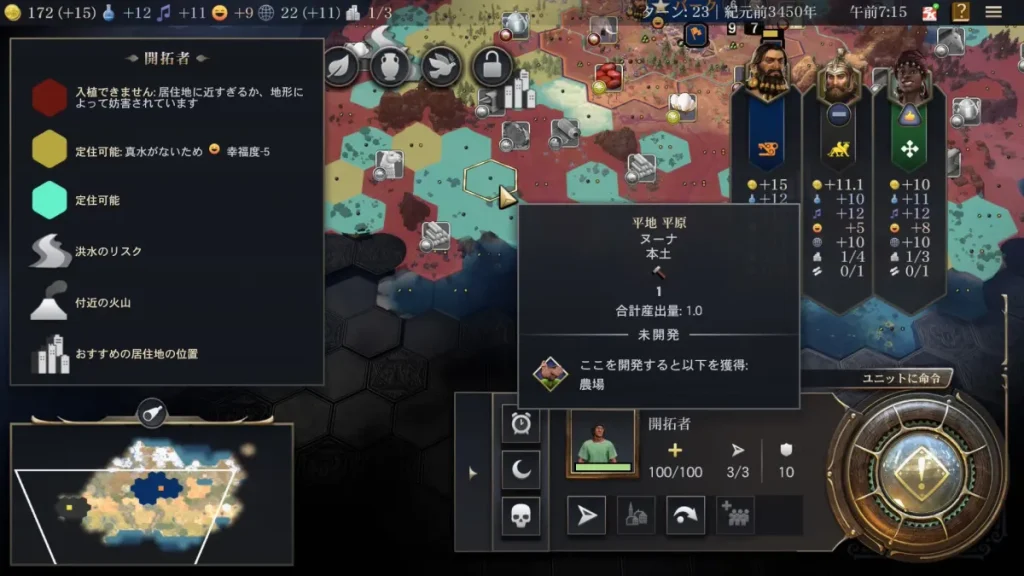 といった感じでしょうか。今回は現在選択されているカーソル位置に居住地を立てることにしました。ちなみに、ビルみたいなマークが付いているところはおすすめの居住地の位置とのことなので最初のうちはそれを目安にしてしまって良いかなと思います(難易度的に、最善を選ばなくても勝てるので)