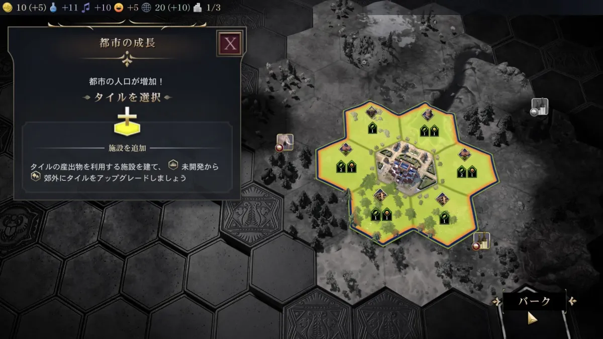 3ターン目になると人口が増えて都市の成長が行えるようになるかと思います。