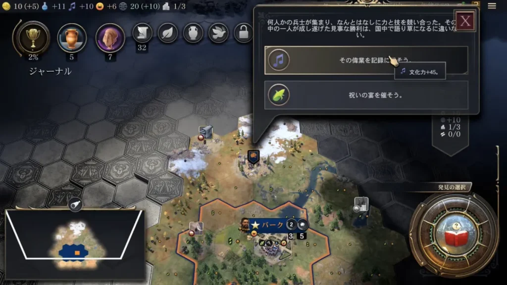めっちゃ見づらいのですが、上の方に光っているマスがありますがこちらを見つけたらなるべく踏むようにしましょう。 イベントマス(発見マスともいう?)では色々な恩恵を受けることができます。中にはユニットがダメージを受けたりしますが基本的にはメリットしかない感じです。 早いもの勝ちなので敵の指導者の斥候ユニットに取られないようにしましょう。