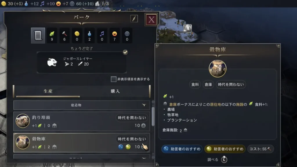その後の生産ですが3体目のジャガースレイヤー(斥候)を作るのもありかなと思いますが「穀物庫」を選びます。