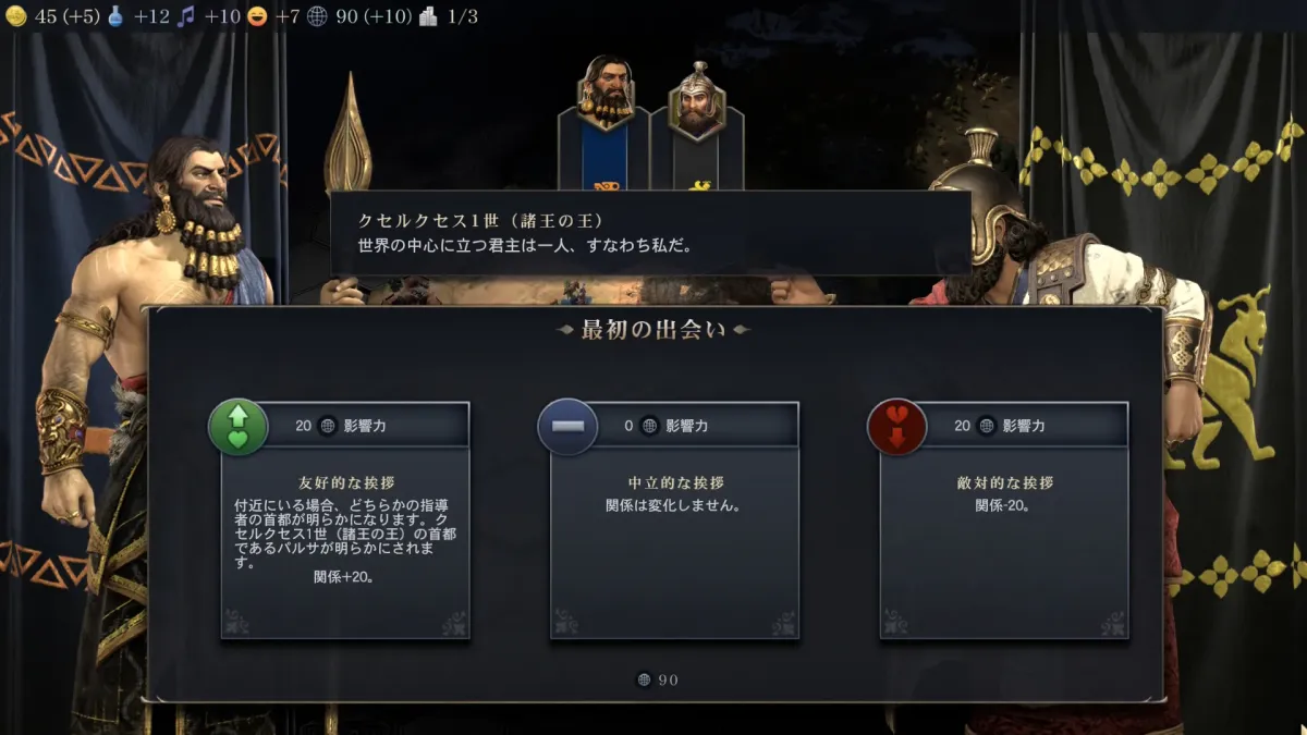 最初の挨拶的なことを選択するのですが友好的な挨拶をしておくのが無難かなと思います。 最初から戦争至上主義で行くのであれば、敵対的な挨拶をしても良いのかなと思うのですが戦争はあんまりメリットが無いのでなるべく友好度は上げておいた方が良いです。