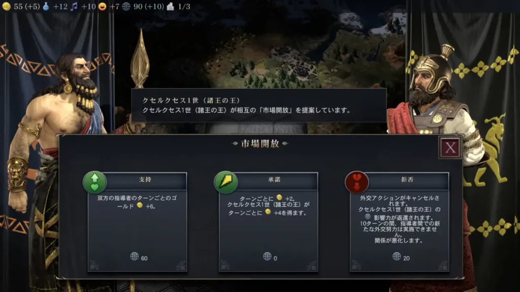 市場開放とか国境開放とか色々提案が来ますが基本的には承諾(影響力に余裕があれば支持)を選びましょう。 戦争したい場合は拒否を選ぶと友好関係が悪化するので宣戦布告がしやすくなります。
