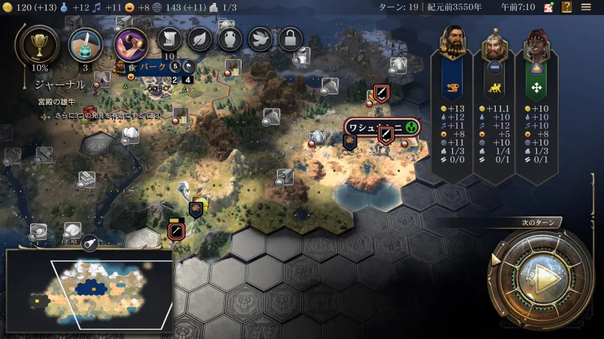 ゲーム開始時にマップの種類で「大陸と島」を選択していると2つの大陸と島々がマップ上に生成されます。 デフォルトの設定では指導者はプレイヤーを含めて6人となるので1つの大陸に3人配置される感じとなります。 古代の時代では基本的には大陸間を移動することができないので2人の指導者と相対することになります。 友好度に関しては極力上げておくと言ったかと思うのですが指導者ごとに性格が設定されているのでどうしても敵対関係になってしまうことがあるのですがそれでもどちらか一方とは友好度を保っておいた方が良いです。 複数の指導者と同時に戦争になると内政が滞りまくるので。