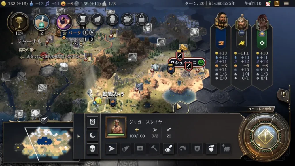 友好的な場合は特に問題ないのですが敵対的な場合は注意が必要です。 敵対的な独立勢力は居住地に斥候を派遣してから戦闘ユニットが侵攻してきます。 前述した通り、ジャガースレイヤーは斥候とは違って攻撃することも可能なので敵対的な独立勢力の斥候を見かけたら攻撃して倒しておきましょう。ギルガメシュの特性で相手ユニットを撃破すると影響力を得ることが出来るので積極的に駆逐していきましょう(但し、友好的な独立勢力や戦争状態になっていない指導者の場合は絶対に手を出しては駄目ですw)