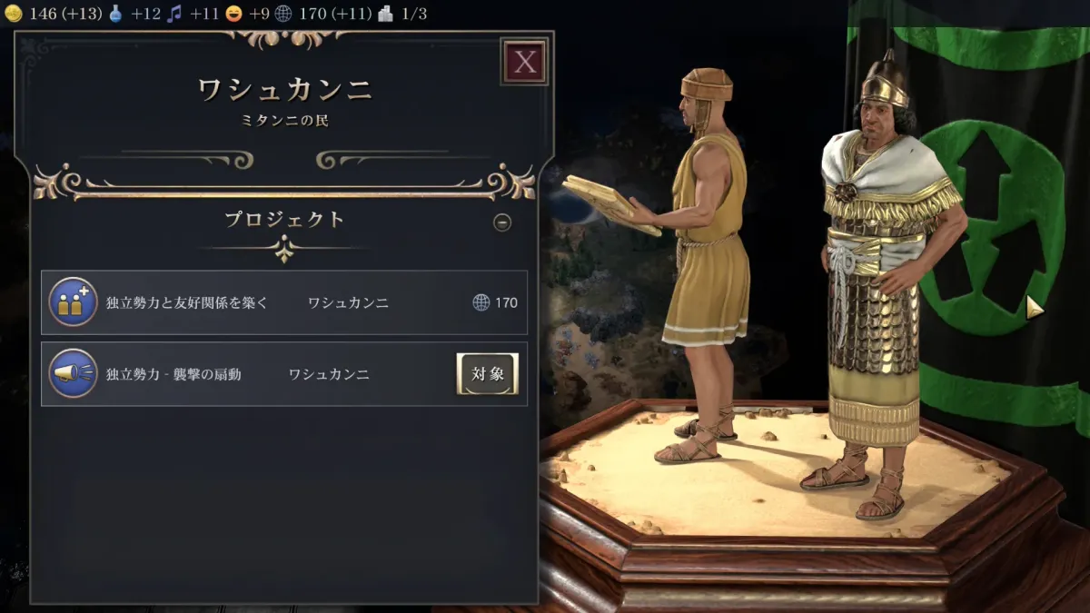 影響力が170になったら独立勢力と友好関係を築きます。 独立勢力自体は倒すこともできますが宗主国ボーナスがなかなか強力なので友好関係を築いて方がメリットが多いです。