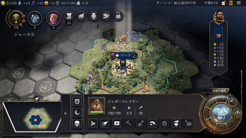前ターンで生産したジャガースレイヤーがバークの中心部から出現します。 ジャガースレイヤーはマヤ文明固有のユニットとなり、他の文明の場合は「斥候」というユニットとなります。 このジャガースレイヤー(斥候)というユニットを使って見えない部分を開拓していくことになります。 基本的に1ターンごとに2マス動かすことが出来るのですが、1マスずつ動かすことが出来るので非表示エリアに移動するときは1マスずつ動かすことが大切です。 移動先に敵対的なユニットがいた場合、逃げることができないので。 ジャガースレイヤーは斥候と違って戦闘することが出来るのですが他のユニットと比べると弱いので慎重に動かして行く必要があります(この難易度だと戦闘時にボーナスがあるのでそこまでしんどくはなかったりします)。 ジャガースレイヤーを居住地の周りを散策させて次の居住地の候補地を探しておきます。