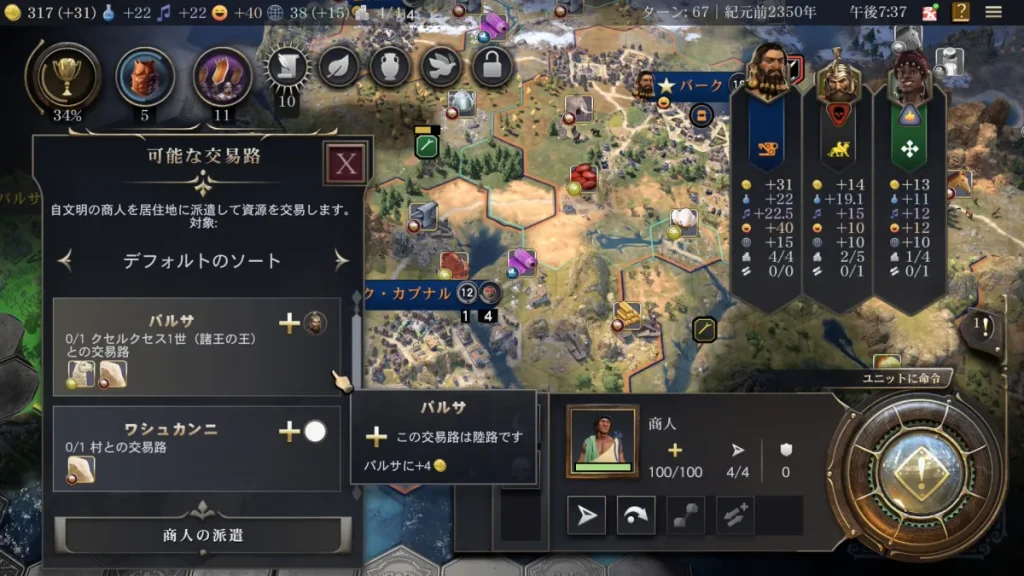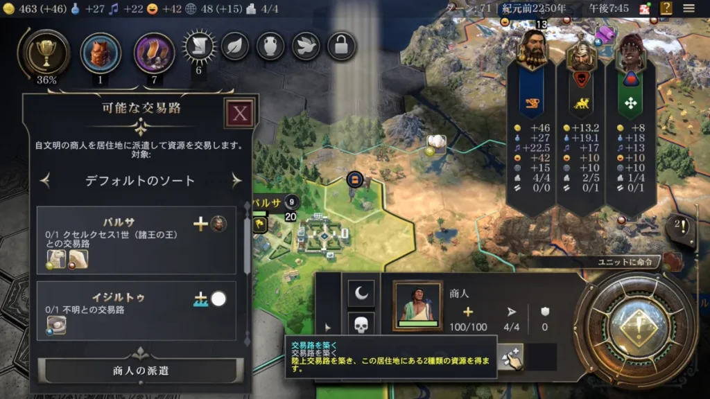 こんな感じです。 他の国と距離が離れすぎていると交易をすることができません。 10マスくらいを目安にすれば良いのですがあまり近すぎると相手国に悪感情を抱かれてしまうので注意が必要です。 商人ユニットに関しては「法典」の研究直後に1ユニットが作られているのですがそれ以外に関しては生産や購入する必要があります。