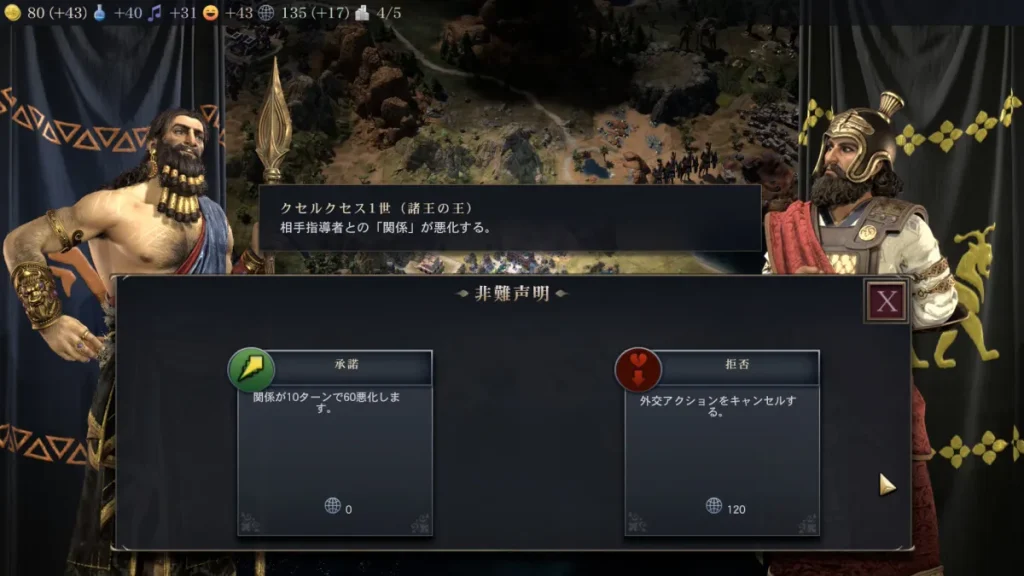 他の指導者と戦争をするにはまずは宣戦布告をする必要があります。 相手との友好度をだいぶ下げないとそもそも宣戦布告することができません。 なので、非難声明とか軍事生産妨害とかをして友好度を下げていきます。相手国も同様で戦争してきたい場合は非難声明とかして友好度を下げてきます