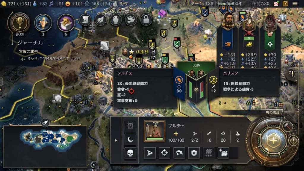わかりにくいかもしれないのですが、現在「フルチェ」という戦闘ユニットを使って、相手国のバリスタに対して攻撃を仕掛けようとしています。 フルチェは遠距離ユニットなので1マス離れた位置から攻撃をすることができます。 相手側のバリスタは攻城ユニットと呼ばれるもので、戦闘ユニットに対しても攻撃することは出来るのですが不得意としていて、「攻城」というだけあって要塞化区域に対しての攻撃を得意としています。 今回はフルチェが一方的に攻撃出来る感じとなってます。