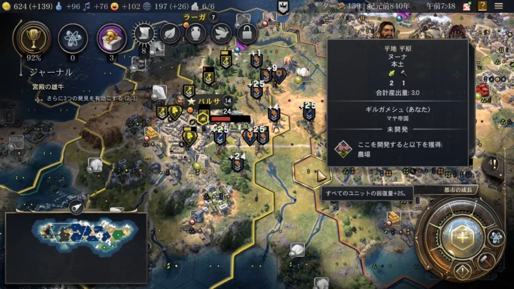左上のトロフィーの絵の下に表示されているのが時代の進行状況です。 概ね100%になるとその時代は終了となります。 ターン数の経過とともにこのメーターは増えて行くのですが、「マイルストーン」と呼ばれる各時代の目標に到達することによってもメーターは増えていきます。