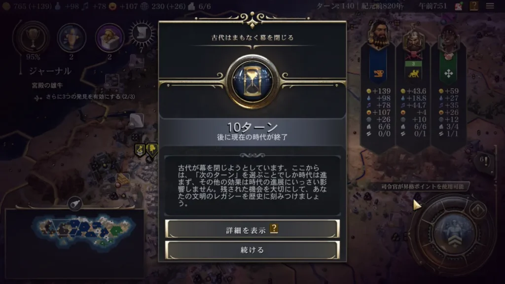 上記のように残り10ターンで終わりやでっていう表示が出てきます。 なので、いきなり古代終了!!っていう感じではなく、あと何ターン後に終わるかどうかがわかるようになっています(昔のバージョンではいきなり終わっていたと思います)