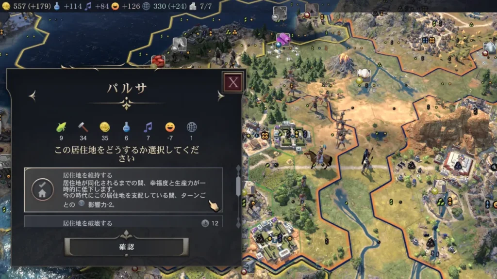 相手国の居住地を占領するとこんな感じで「居住地を維持する」か「居住地を破壊する」の2択を迫られます。
