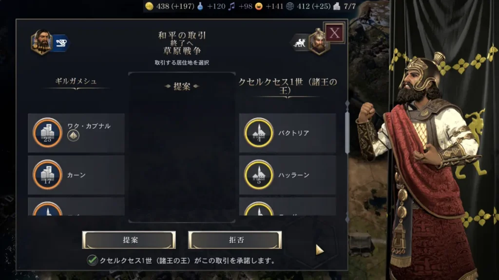 戦争後、一定ターン数が経過すると和平を結ぶことができます。 和平に関しては拒否することも可能ですが、戦争の状況によっては、相手国の居住地をタダでもらうこともできます。