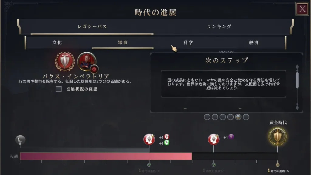 第1段階では特に時代の進行状態への影響はないのですが第2段階と第3段階を達成すると「時代の進展+5」となります。 +5=5%増える、というわけではないみたいですがメーターが一気に5%弱程度増えます。