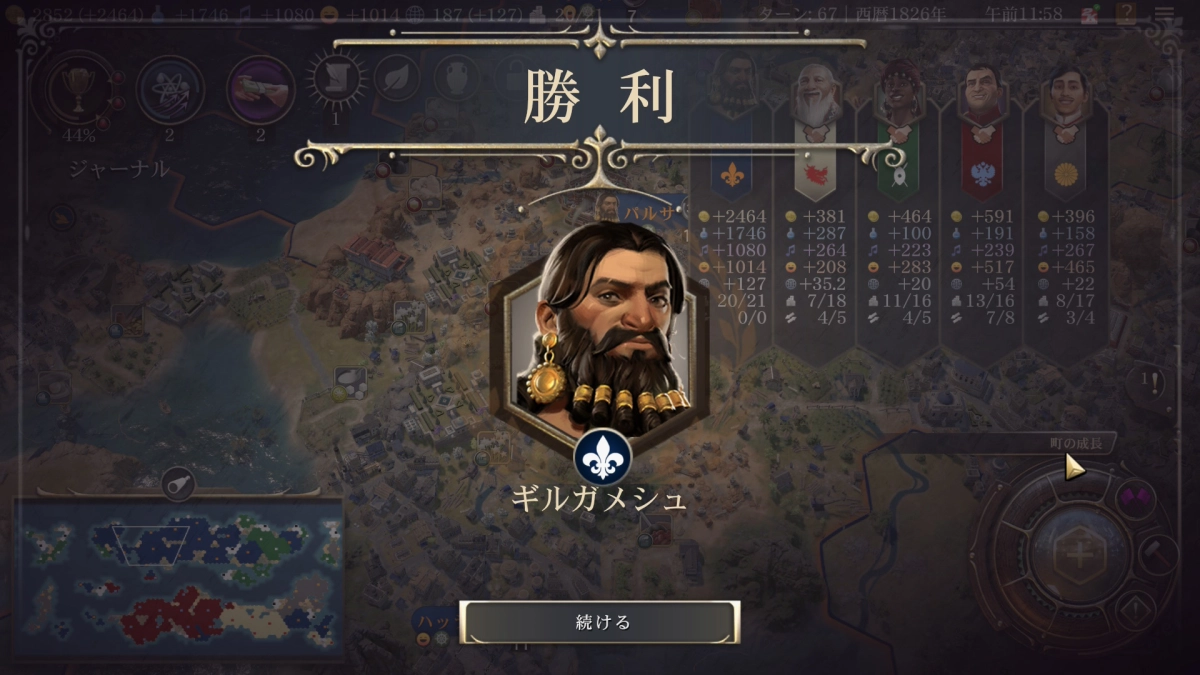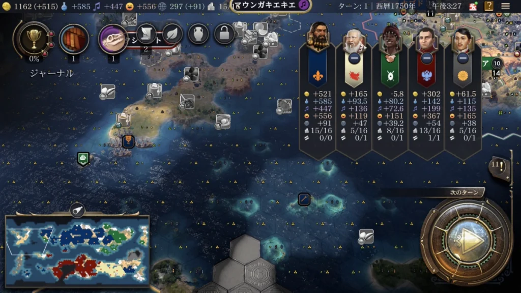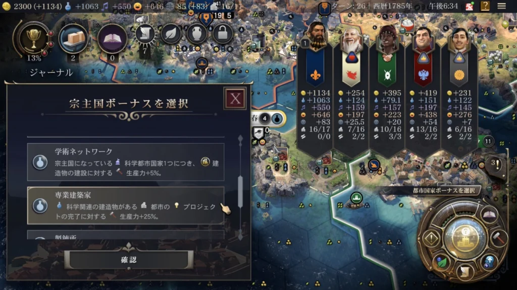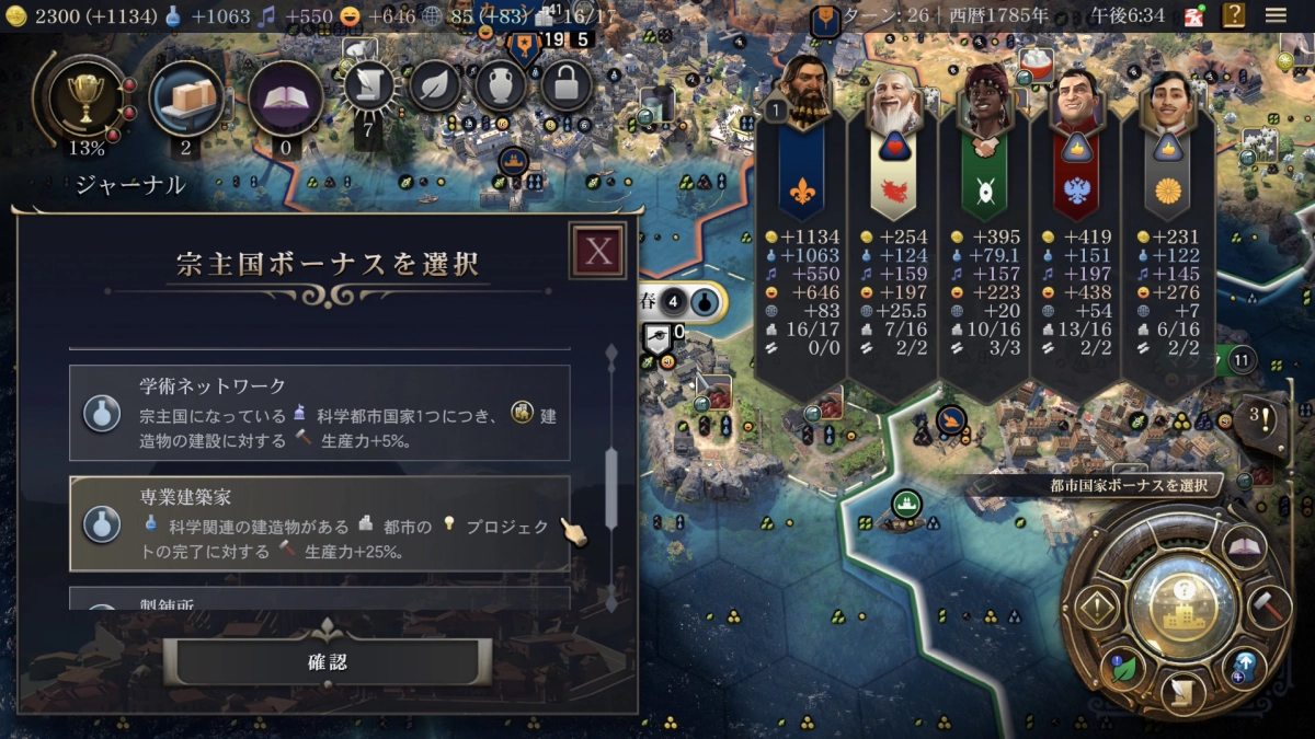 科学勝利を目指すために科学力をとことん上げていく感じで選択しました。あと、今回も遷都があるのですがすっかりとり忘れてしまいましたw ちゃんと取った方が良いです。