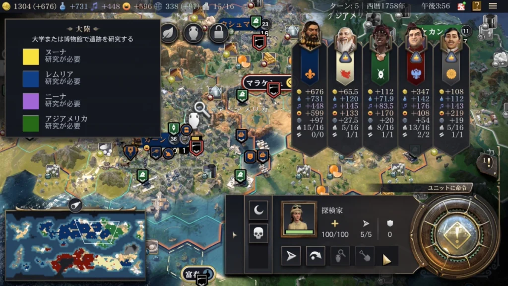 壺と虫眼鏡のマークのマスが中央付近にあると思うのですがまずはそこまで探検家を移動して研究を行います。 研究には一定ターンかかるのですが研究が終わると発掘を行うことができます。研究を完了させた大陸のどこかに遺跡がある(虫眼鏡のマス)はずなのでそちらに移動後、