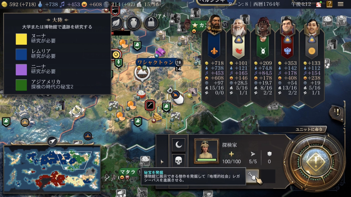 「秘宝を発掘」をクリックすることによって一定ターン経過後に秘宝をゲットすることができます。 すでに他国の探検家に先を越されてしまっていた場合、発掘はできないので早いもの勝ちとなります。 秘宝をゲットしたらスロットにセットする必要があるので別途博物館などの建造物を建てる必要がありますが今回はそこそこにして留めておきます。