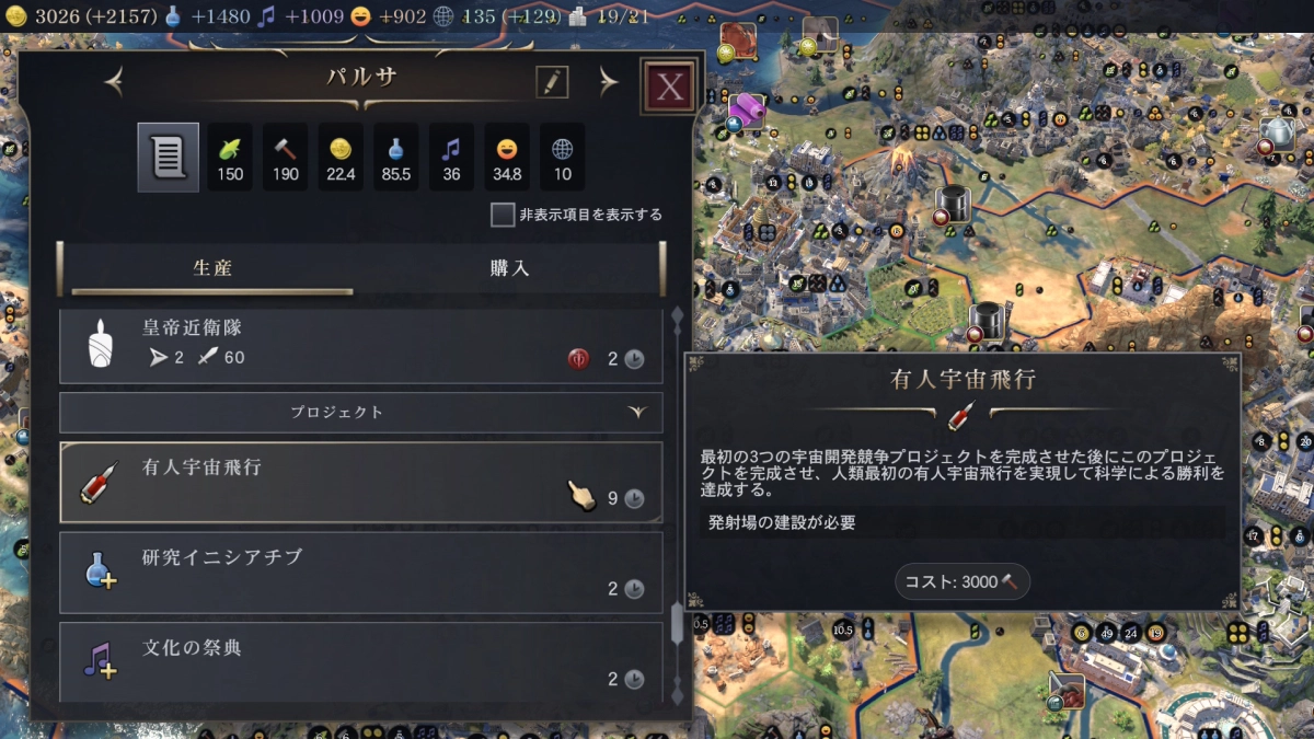 科学技術の方はまずは学府→軍事学と進めて生産力を高める施設を作れるようにしました。 プロジェクトっていうのが科学勝利の条件になってくるのですがこのプロジェクトも研究するために生産力が必要なのでいくらあっても良い感じです。