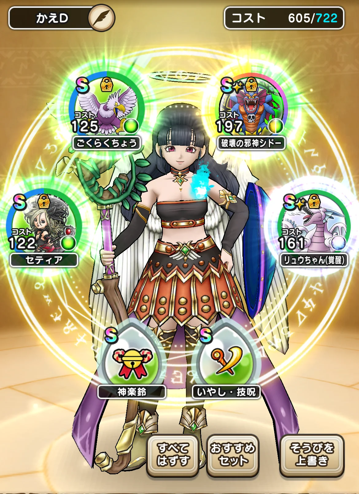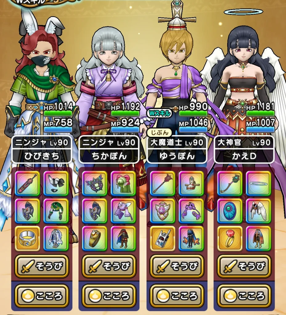 使用機会を作ろうと雪月花を装備していたのですが、神喰らいの大剣に変更しています(装備やこころは特に変更無し!)。 また、竜神王の杖を持たせていたドラゴンも大神官に転職して回復寄せにしました。