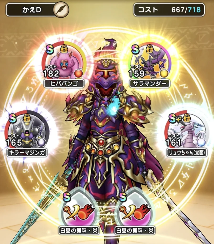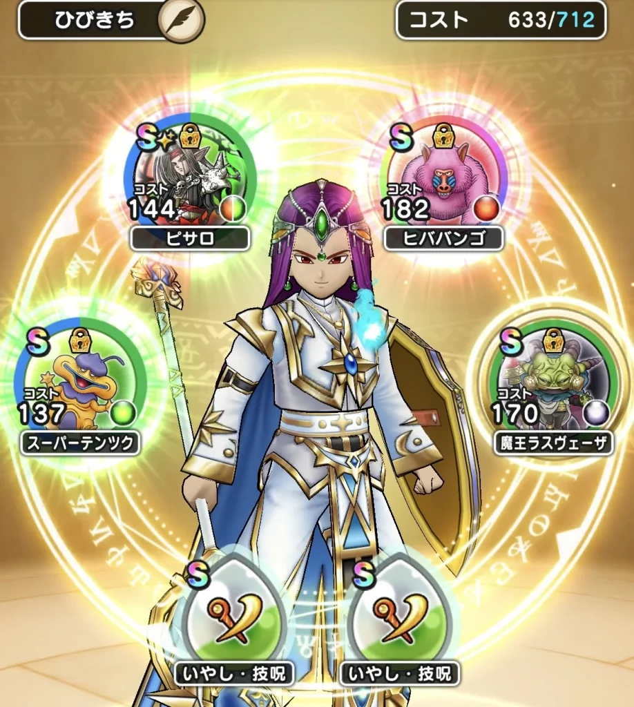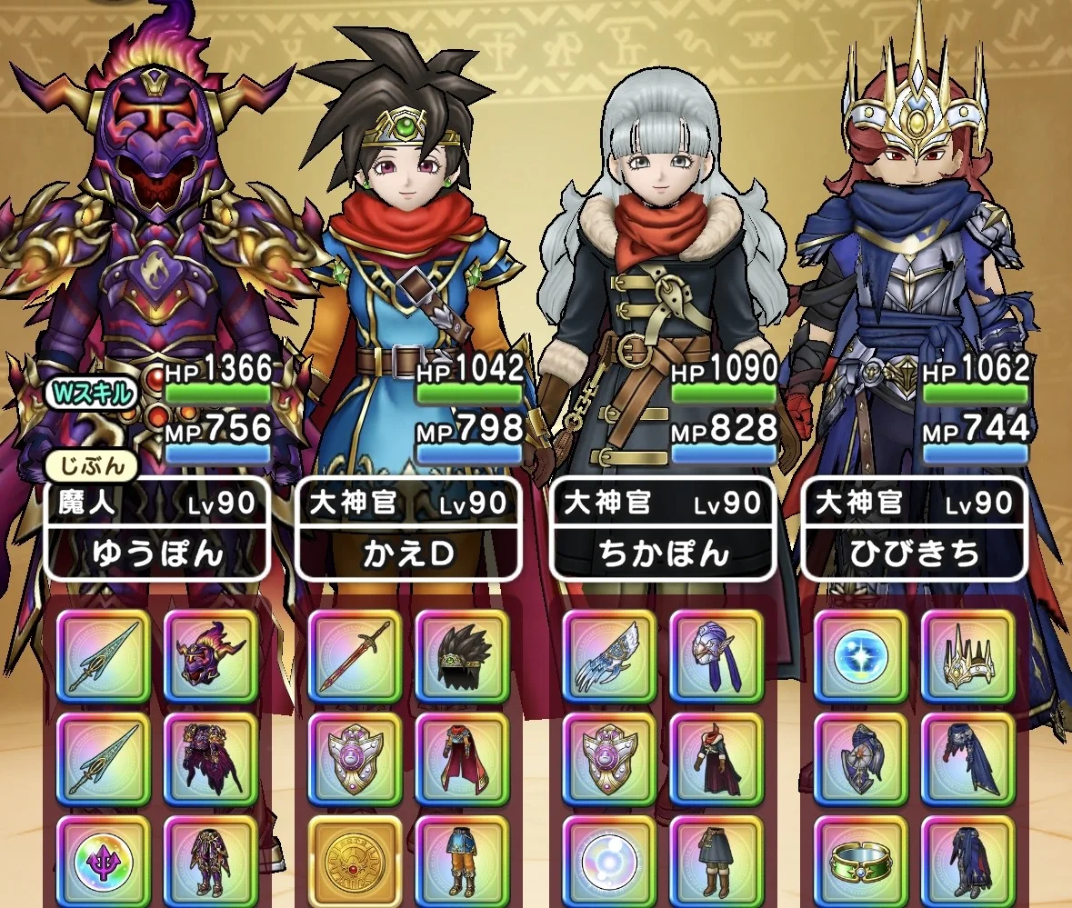1ターン目にゼッペルが吹き飛ばしを使ってきますが毎回固定?されているような気がしてますが法則があったりするんですかね… 田中の場合は先頭の魔人が吹き飛ばしの対象にされたのでもう1人の魔人が初手に「会心必中のかまえ・刻」を使って2ターン目以降に「時戻しの刃」を使っていく感じです。大神官の2人はひたすら回復するって感じですかね。 運が悪いと魔人達がマヌーサで幻惑状態になるのでそのときはマヌーハを使って解除させる感じです。