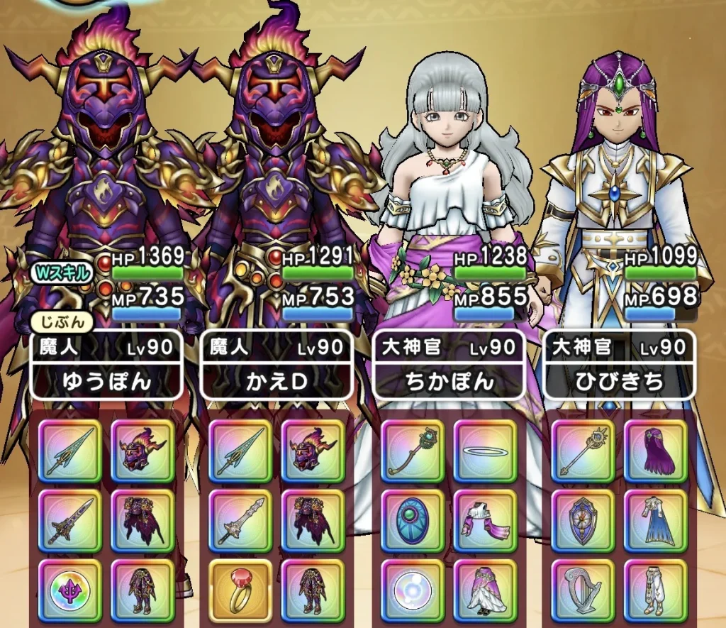 きとうしが1ターン目に「厭世の霧」を使ってテンションを下げてくるので全員にヒババンゴを装備しています。 魔人の2人はメラ特化でどちらもクロノスソードを持たせています。 1本しか持っていない場合はこちらも神喰らいの大剣とかでも良い気がします(領域のレベルアップが良さそう?)